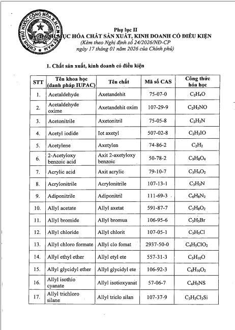 Ngày 17/01/2026, Chính phủ đã chính thức ban hành Nghị định số 24/2026/NĐ-CP. Đây là văn bản pháp lý quan trọng nhằm chi tiết hóa các danh mục hóa chất thuộc phạm vi điều chỉnh của Luật Hóa chất, tạo hành lang pháp lý minh bạch cho các hoạt động sản xuất và kinh doanh trong lĩnh vực này.