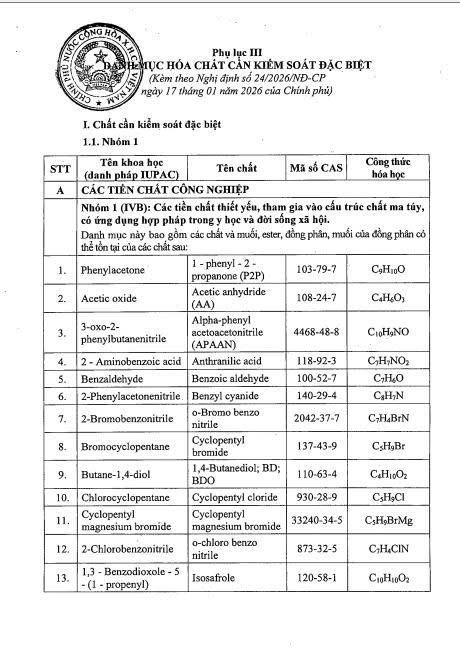 Nhóm 1 (154 hóa chất): Bao gồm tiền chất công nghiệp nhóm IVB, hóa chất thuộc Công ước cấm vũ khí hóa học (Bảng 2) và các chất cực kỳ nguy hại.