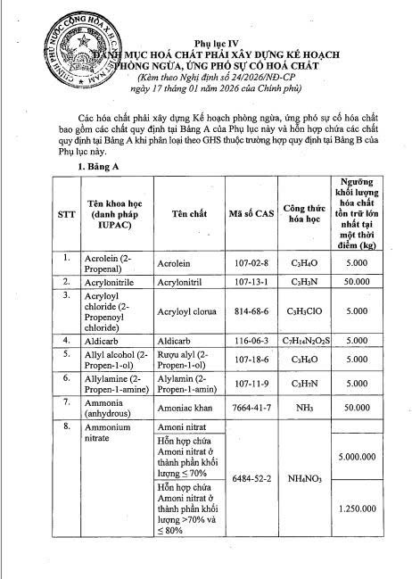 Đây là danh mục mang tính kỹ thuật cao, quy định rõ ngưỡng khối lượng tồn trữ tối đa tại một thời điểm. Nếu vượt ngưỡng này, doanh nghiệp bắt buộc phải lập Kế hoạch phòng ngừa và ứng phó sự cố hóa chất.